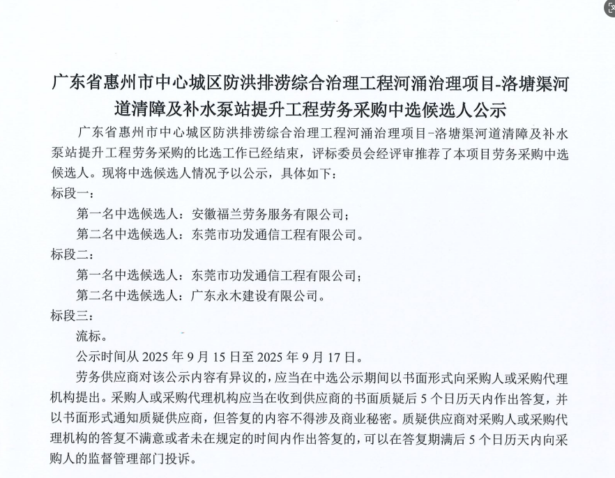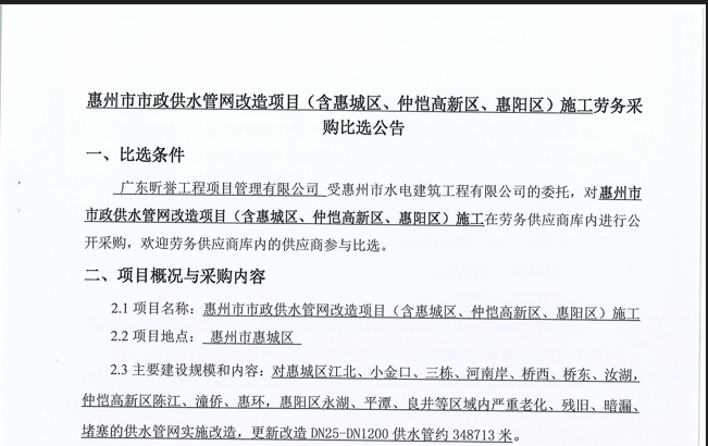 廣東省惠州市中心城區(qū)地下管網(wǎng)系統(tǒng)提升工程-內(nèi)街小巷排水管網(wǎng)病害修復(fù)及錯(cuò)混接改造項(xiàng)目一期施工勞務(wù)采購(第二次)中選候選人公示……